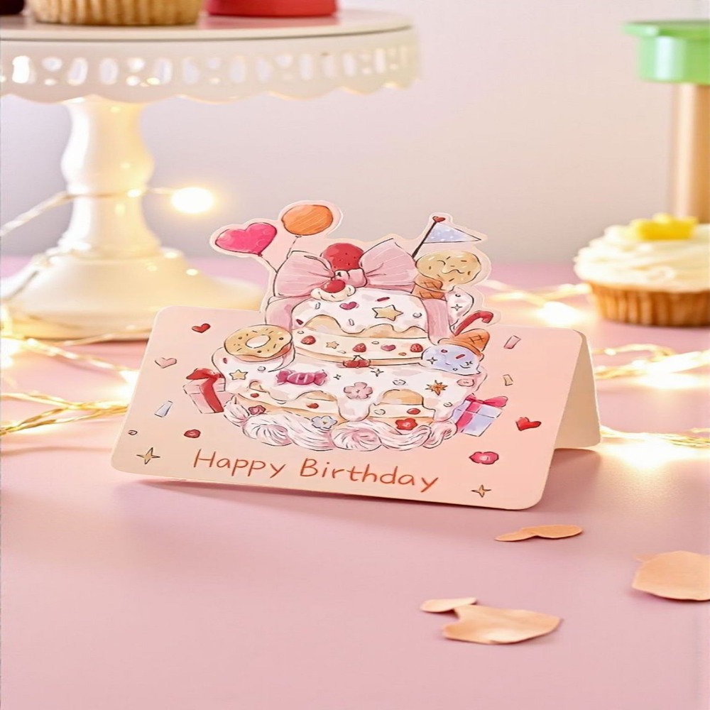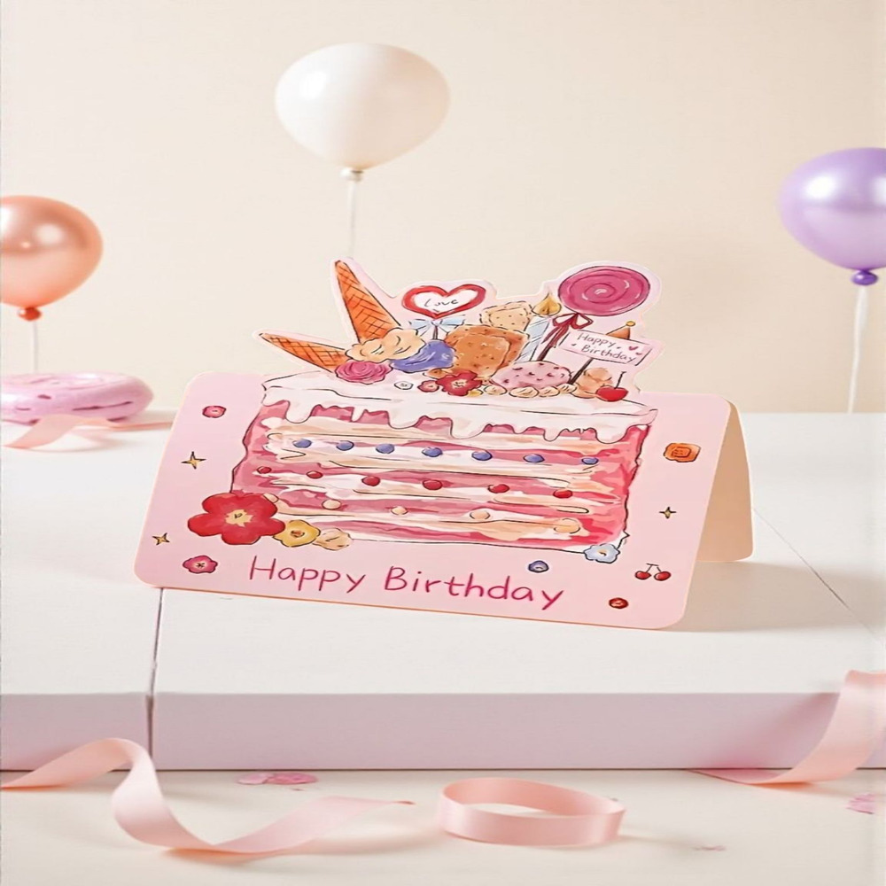 Each card is a tiny piece of joy — featuring dreamy birthday cake designs topped with bows, strawberries, and balloons